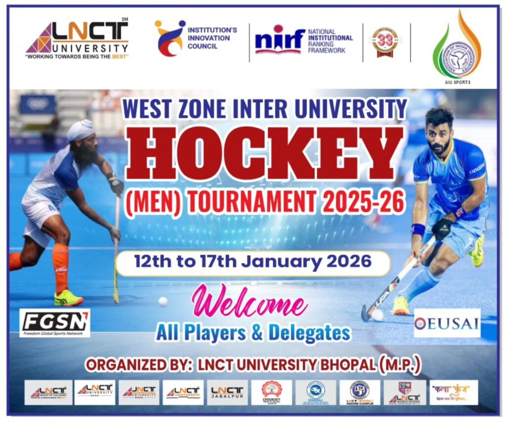 एलएनसीटी विश्वविद्यालय,भोपाल अखिल भारतीय विश्विद्यालय संगठन के तत्वावधान में दिनांक 12 से 17 जनवरी 2026 तक पश्चिम क्षेत्र अंतर–विश्वविद्यालयीन हॉकी (पुरुष) प्रतियोगिता 2025-26 का भव्य आयोजन कर रहा है।