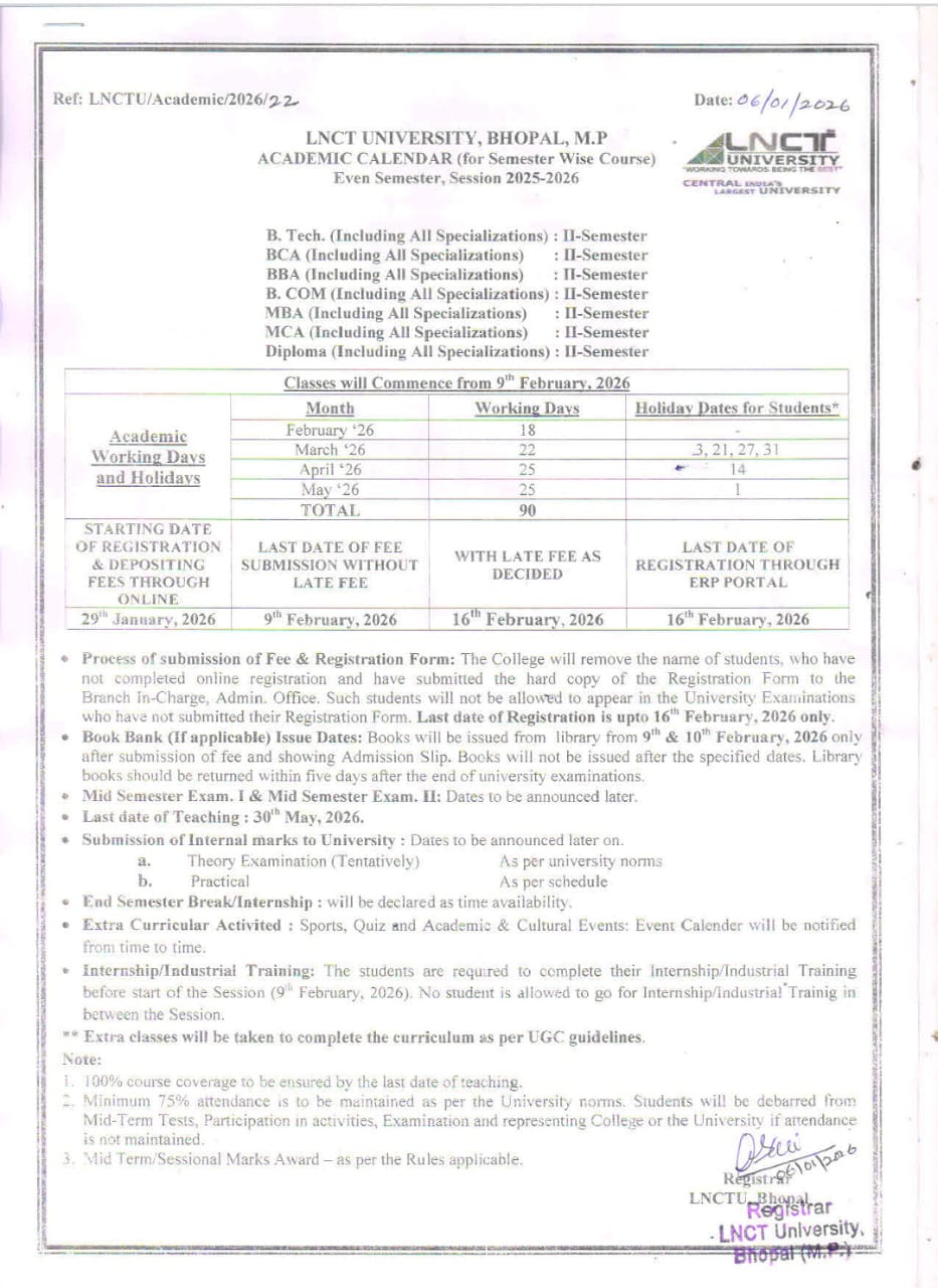 Academic-Calendar LNCT University is one of the best private universities in Bhopal and central India. LNCT is synonymous with excellence in higher education.