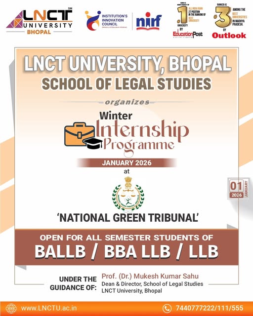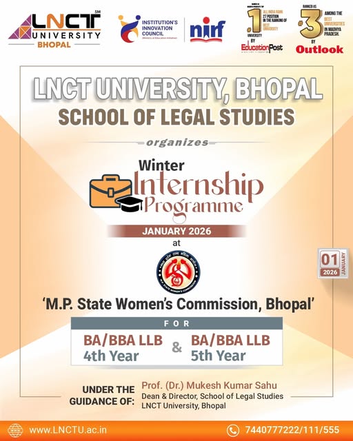 Winter Internship Programme – January 2026 LNCT University, Bhopal – School of Legal Studies proudly organizes a Winter Internship Programme at the M.P. State Women’s