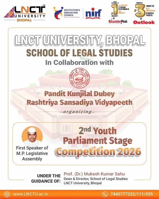 LNCT University, Bhopal – School of Legal Studies, in collaboration with Pandit Kunjilal Dubey Rashtriya Sansadiya Vidyapeeth, proudly presents the 2nd Youth Parliament Stage Competition