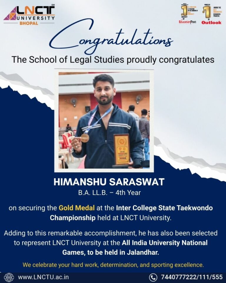 Congratulations to Himanshu Saraswat on this powerful achievement! A proud moment for LNCT University as our B.A. LL.B. 4th Year student Himanshu Saraswat clinches the