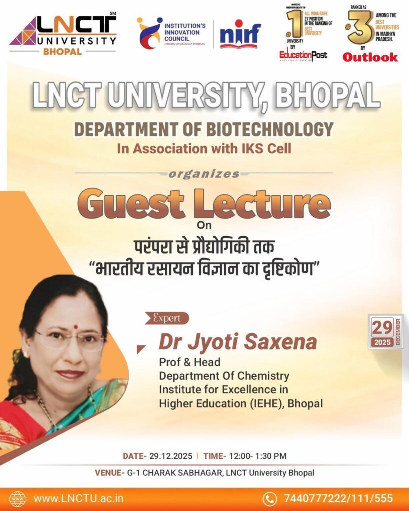 Department of Biotechnology, LNCT University, Bhopal, in association with the IKS Cell, successfully organized a Guest Lecture on the theme “परंपरा से प्रौद्योगिकी तक: भारतीय रसायन विज्ञान का दृष्टिकोण” (From Tradition to Technology: Indian Perspective of Chemistry) on 29 Dec 2025